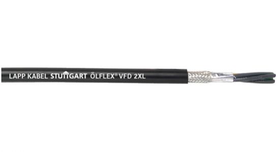 Широко известная компания Lapp Group разработала кабель для электродвигателей насосов, компрессоров, прессов, конвейеров, который характеризуется прочным и стойким экранированным конструктивным исполнением к влиянию нефтяных продуктов и рассчитан для применения с частотно-регулируемыми приводами. Особенность OLFLEX VFD 2XL заключается в том, что он предназначен для работы с двумя номиналами напряжениями в диапазоне от 600…2000В. Его конструкция выполнена таким образом, что обеспечивает ему максимально гибкую структуру, небольшое емкостное сопротивление и не поддерживание горения. Помимо этого, содержит отдельную пару, которая назначена для осуществления контроля процесса торможения и температурных показателей. Изоляционный слой из сшитого полиэтилена, внешний покров из специфического термопластичного эластомера. Именно благодаря таким характеристикам электрокабеля достигается колоссальные электрические свойства и высокий уровень устойчивости к нагреваниям, что характерно при его назначении. Экран состоит из трехслойной ленты из фольги и медной оплетки. Особенно кабель OLFLEX VFD 2XL будет как раз для эксплуатации в промышленном секторе.